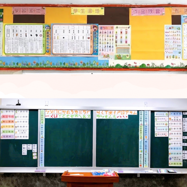 開學第一天,在黑板上貼上專心海報,並建立小一新生上課的規矩。另外,教室牆上的靜心角就是老師協助處理孩子狀況的好地方,美觀又實用,真是一舉數得呢!